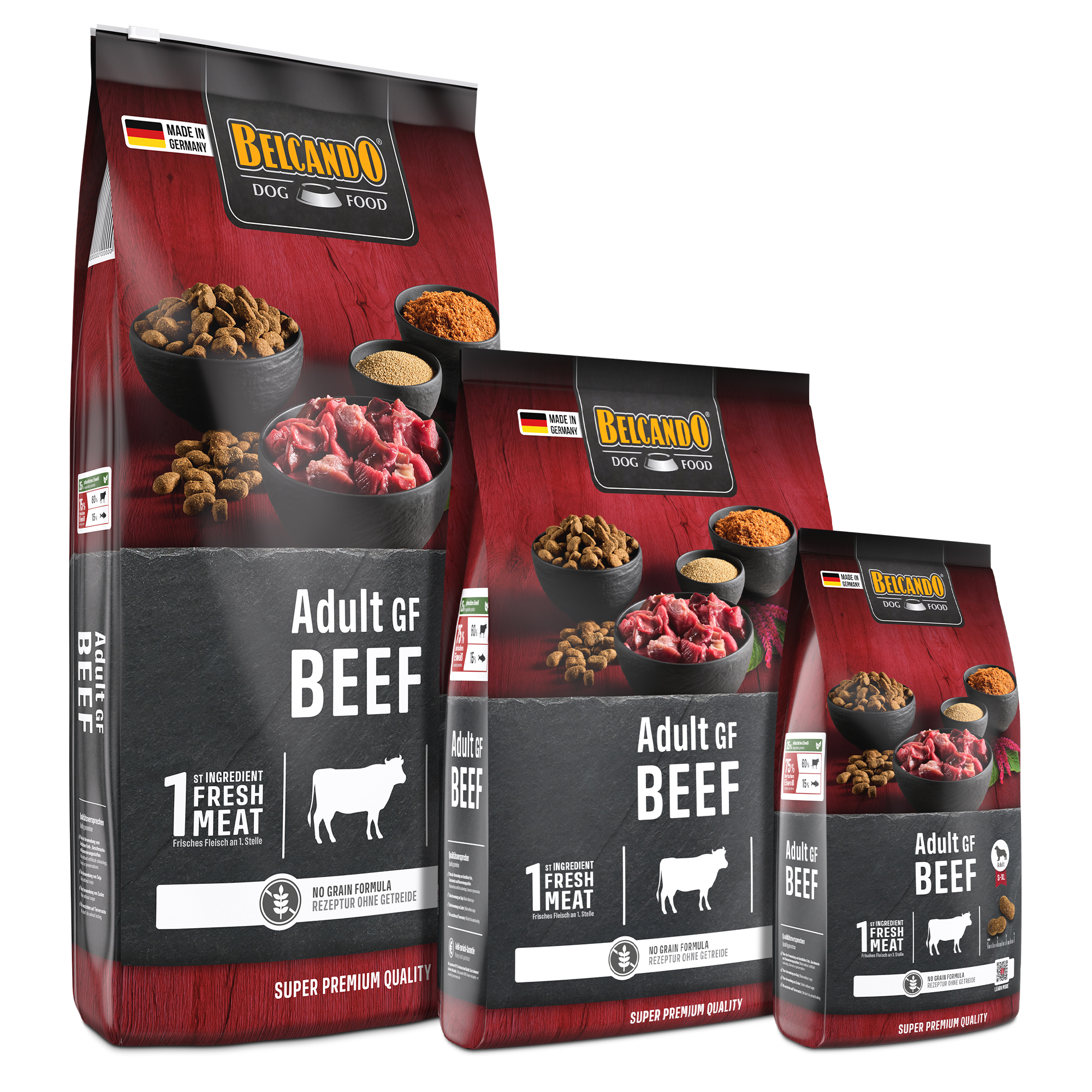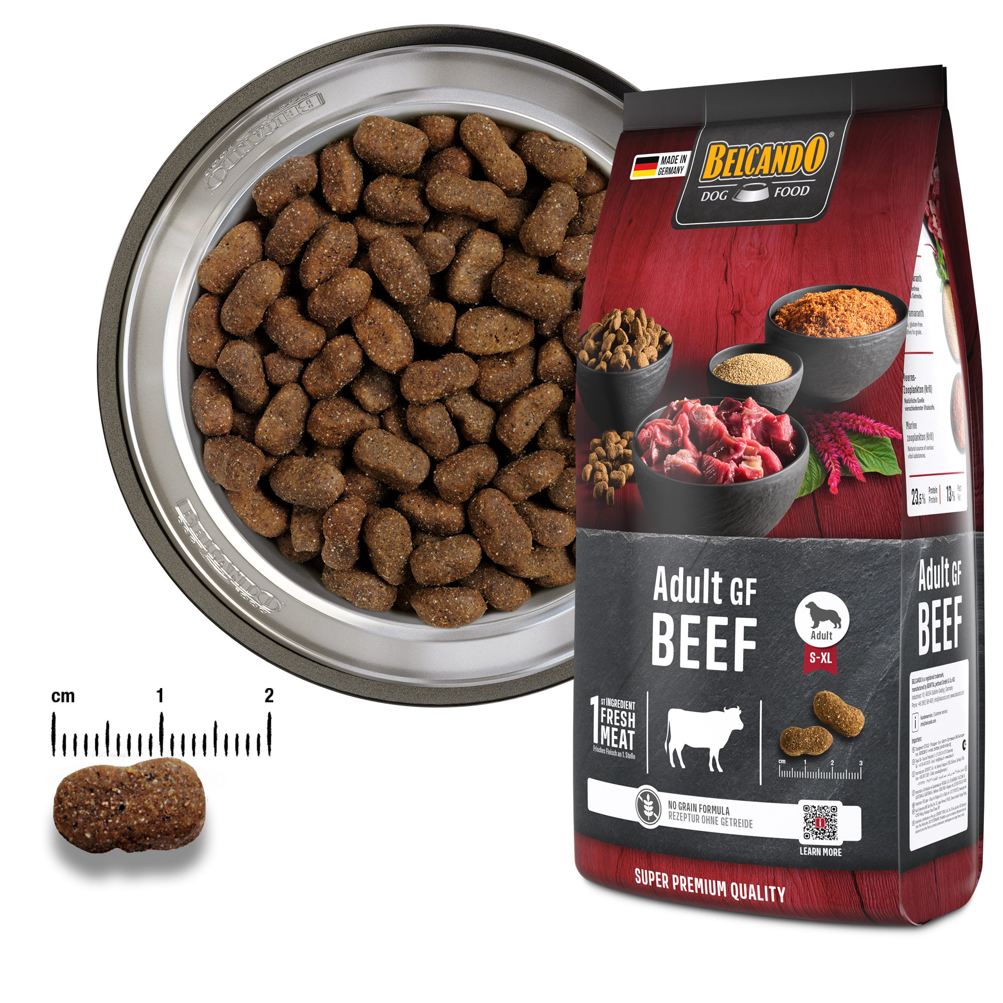 In der nach unserem holistischen Ernährungskonzept entwickelten Rezeptur wird das Getreide durch hochwertigen Amaranth ersetzt, welcher deutlich höhere Gehalte an wichtigen Nährstoffen (Protein, essentielle Aminosäure Lysin, ungesättigte Fettsäuren, Mineralstoffe, Spurenelemente) aufweist. Krill dient als Quelle verschiedenster Vitalstoffe. Der hohe Frischfleischanteil macht BELCANDO Adult GF Beef zudem zu einem wahren Gaumenschmaus, selbst für wählerische Hunde. Der Gehalt an Protein und Fett ist dabei auf die Bedürfnisse ausgewachsener Hunde aller Rassen mit normaler Aktivität abgestimmt.